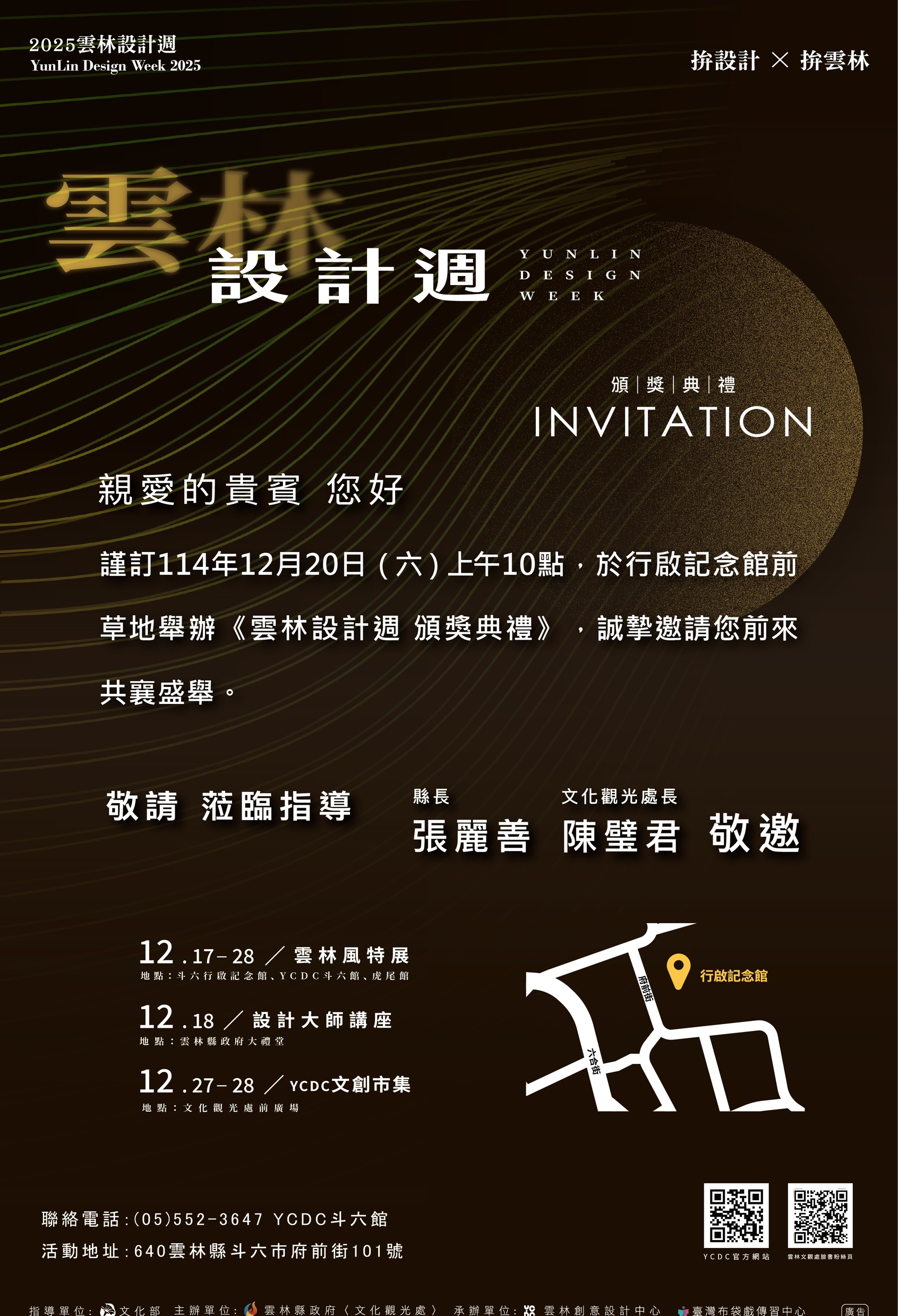 Hot News News 2025 年 12 月 18 日 再次恭喜獲獎者,誠摯邀請您蒞臨「2025 雲林設計週頒獎典禮」,讓我們一同見證設計成果的榮耀時刻。您的作品為雲林注入嶄新創意能量,期盼於典禮現場與您共享這份肯定,並與各界設計夥伴交流共聚。 時間:2025年12月20日 地點:斗六行啟紀念館前草地